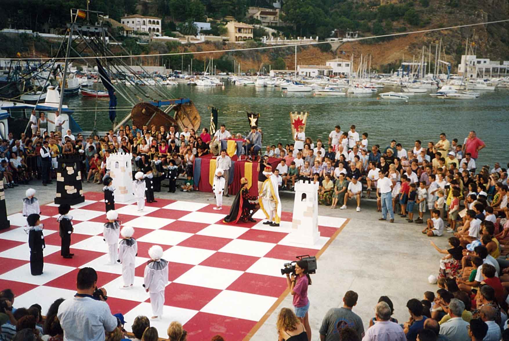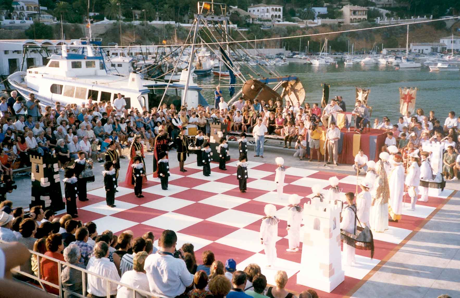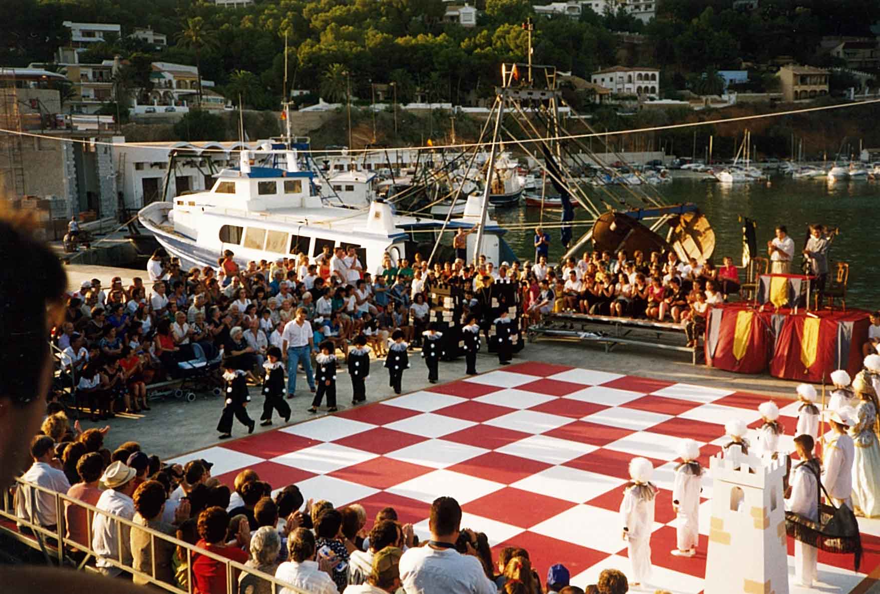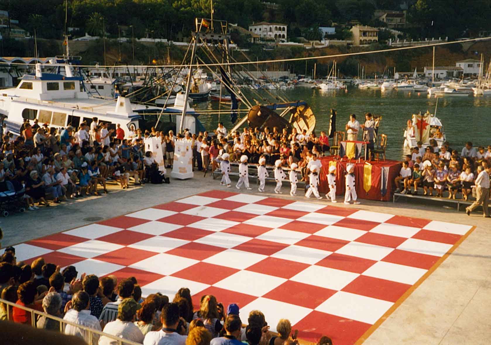 Hacía años que me atraía la idea de organizar un ajedrez viviente, pero no fue hasta 1.995 cuando la Comisión de Fiestas del Puerto de Xàbia, conocedora de la misma, decidió programarla para el año siguiente con ocasión del I Centenario de sus Fiestas Patronales. El caso es que todo empezó con buen pie y en poco tiempo logramos el apoyo del Ayuntamiento y de la Caja de Ahorros del Mediterráneo.