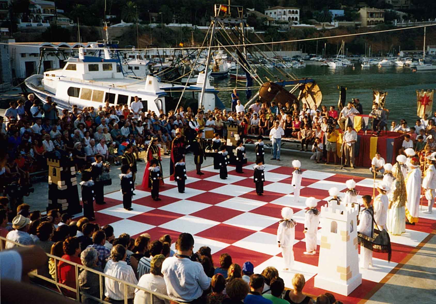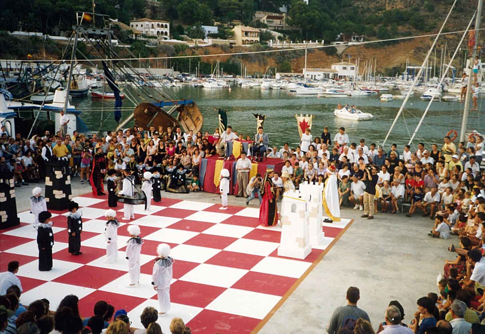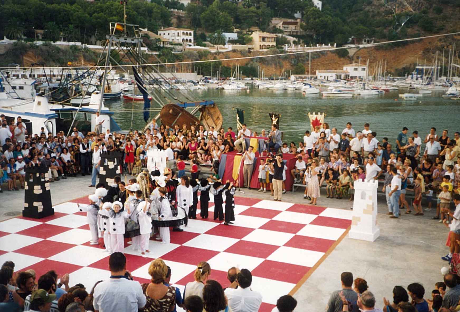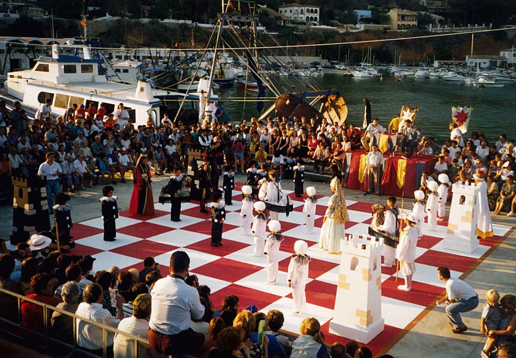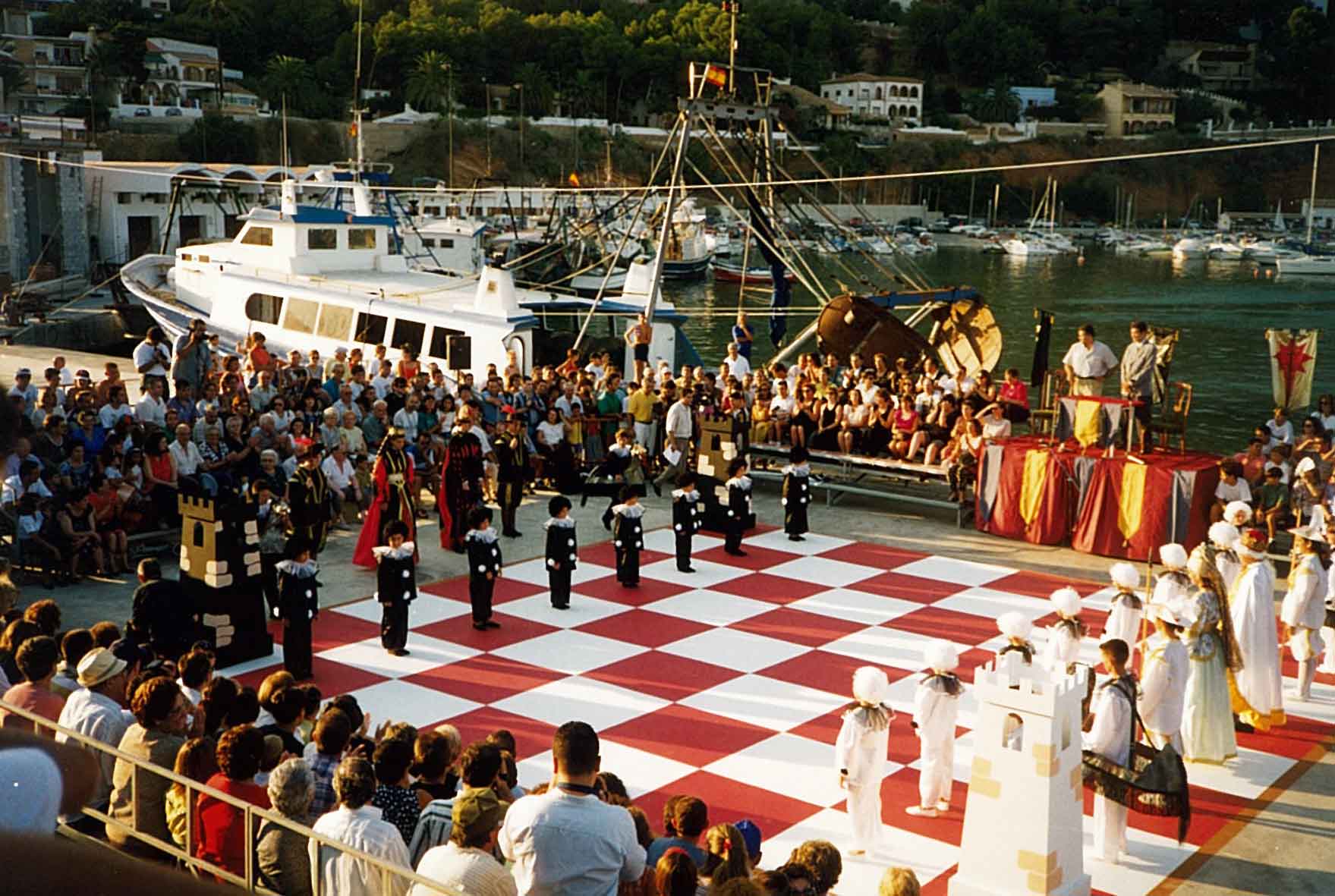 Hacía años que me atraía la idea de organizar un ajedrez viviente, pero no fue hasta 1.995 cuando la Comisión de Fiestas del Puerto de Xàbia, conocedora de la misma, decidió programarla para el año siguiente con ocasión del I Centenario de sus Fiestas Patronales. El caso es que todo empezó con buen pie y en poco tiempo logramos el apoyo del Ayuntamiento y de la Caja de Ahorros del Mediterráneo.