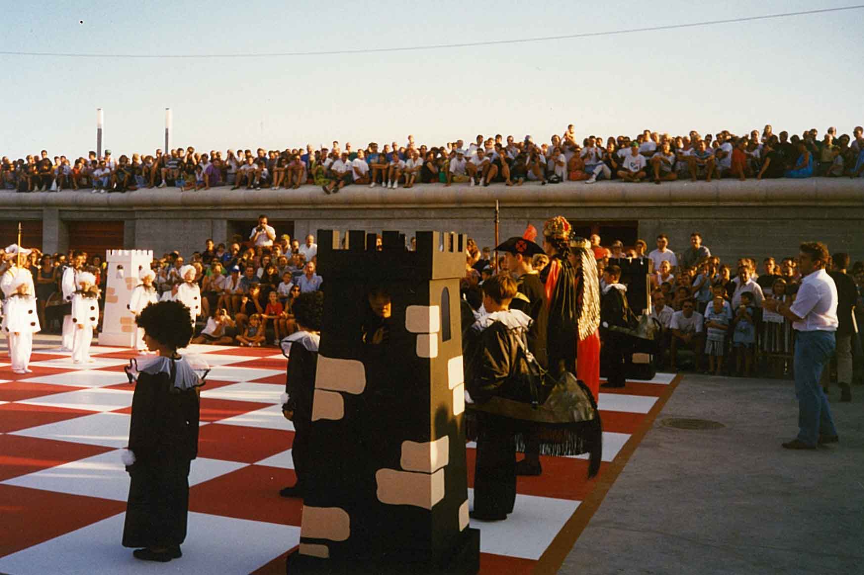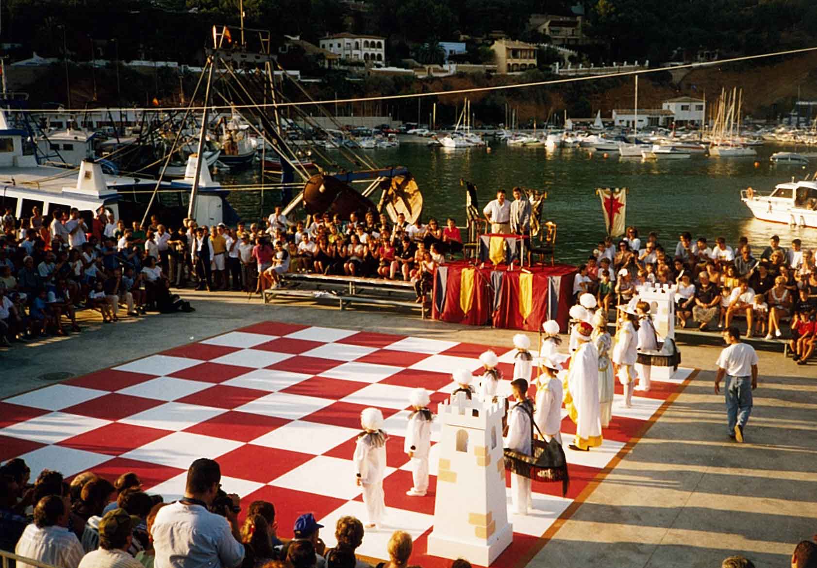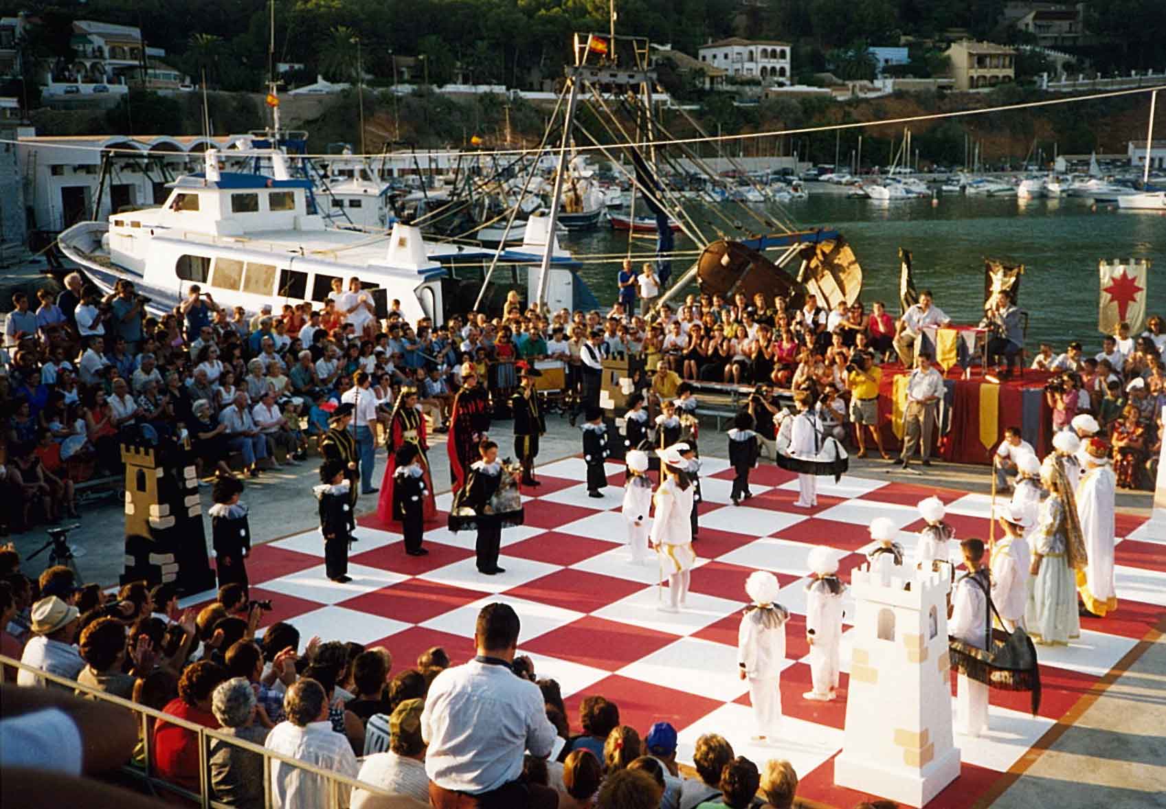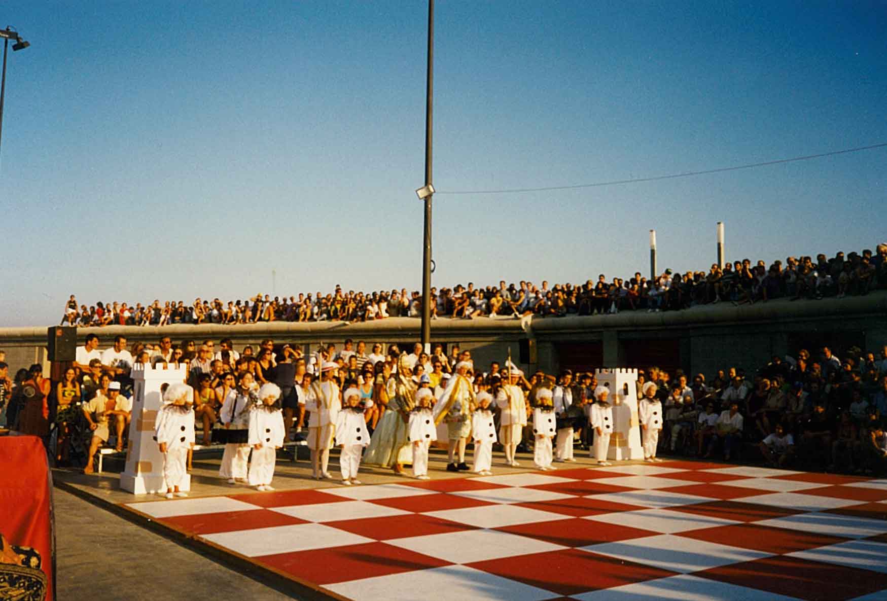 Hacía años que me atraía la idea de organizar un ajedrez viviente, pero no fue hasta 1.995 cuando la Comisión de Fiestas del Puerto de Xàbia, conocedora de la misma, decidió programarla para el año siguiente con ocasión del I Centenario de sus Fiestas Patronales. El caso es que todo empezó con buen pie y en poco tiempo logramos el apoyo del Ayuntamiento y de la Caja de Ahorros del Mediterráneo.