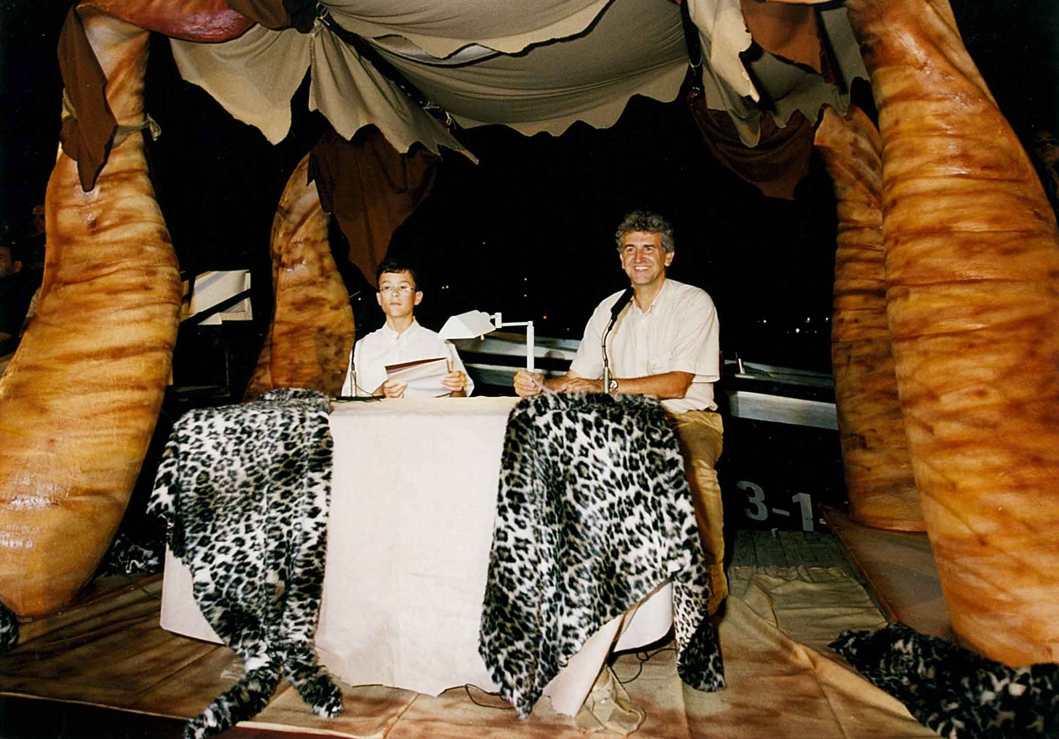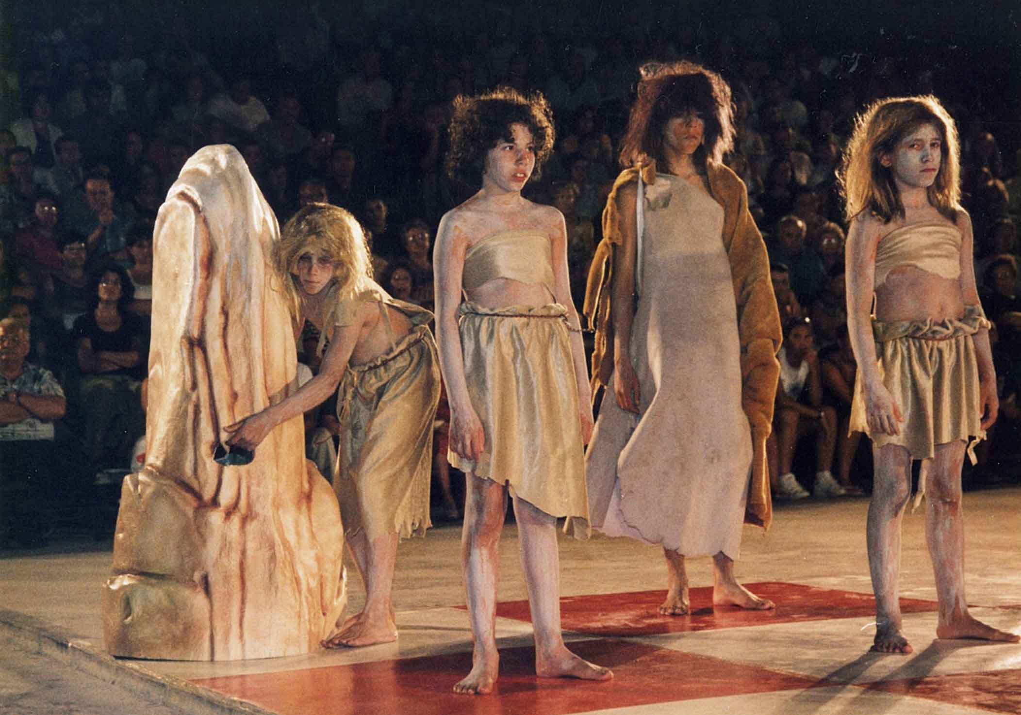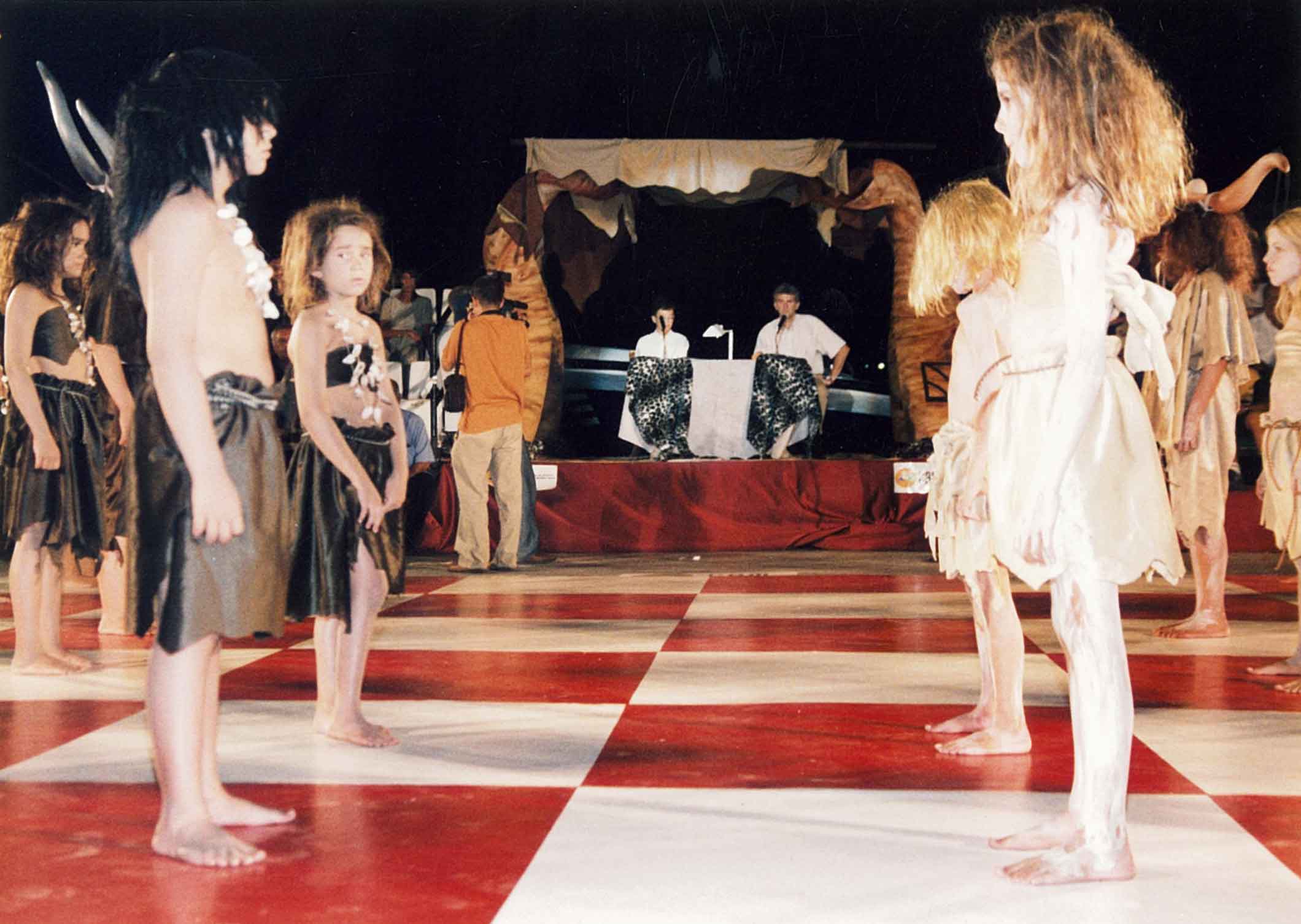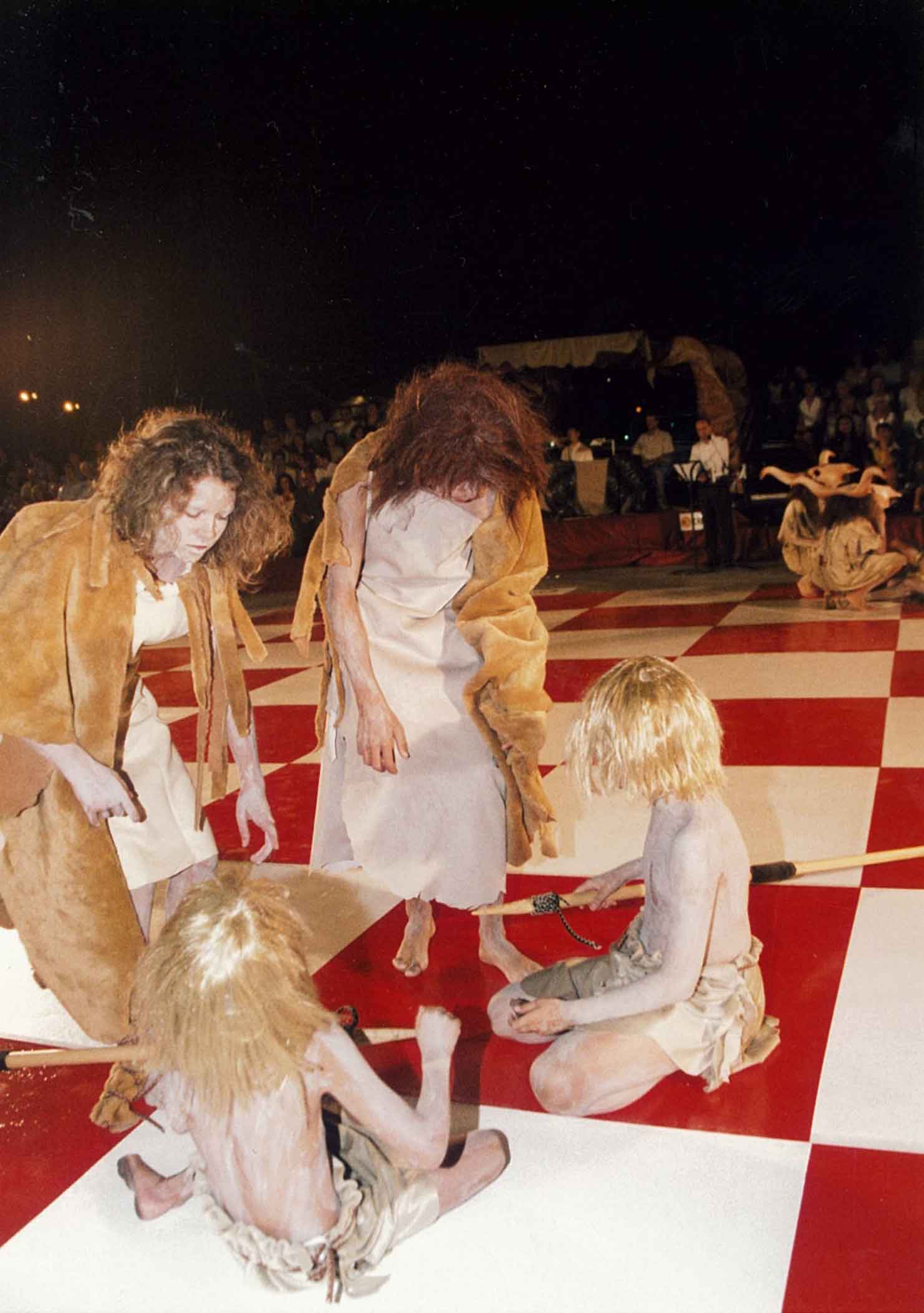 El argumento, escrito por Rafael Andarias, emocionó a todos los espectadores. Recreó el Origen del Hombre desde su aparición en Africa hace 2´5 millones de años, hasta la coexistencia en Europa de dos especies humanas distintas, los neandertales y los cromañones, centrándose parte de la historia en la Cova Foradada del Cabo de San Antonio. En definitiva, una «historia nuestra» pero con un carácter universal. Las blancas encarnaron al bando neandertal y las negras al cromañón, con un vestuario y maquillaje, preparado por Mari Ros, Rosa Miralles, Carmen Vicens, Vicenta Andrés y Mª José Cholbi, que recibió todos los elogios, al igual que la decoración del escenario de Pepa Ferrer, Pepita y Conchita Bertolín. También intervinieron como ayudantes de escena y protocolo José Cardona, Dionís Henarejos, Vicente Gavilá, Francisco Pastor, José Buigues y Gaspar Moya; como regidor y director musical José Mata; e Isabel Henarejos y Alain Vandeweghe en la dirección de escena.