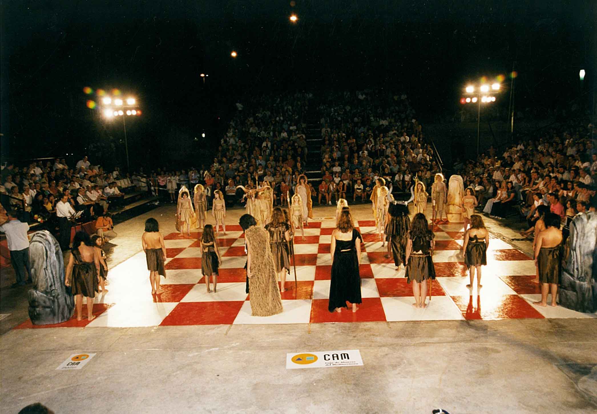 La representación que estuvo acompañada por una escogida selección musical, tuvo momentos emocionantes como la escena inicial en la que dos niños neandertales aparecían en el tablero con unas antorchas y daban paso a los peones que realizaron trabajos prehistóricos (hacer cuerdas, afilar lanzas, tallar piedras y curtir pieles); las magníficas interpretaciones relacionadas con piedras, arpones y otras herramientas de Esther Recio, Rafa Sivera, Alejandro Garrido y Juan Crisóstomo; las espectaculares pinturas rupestres ejecutadas sobre las «rocas», que hacían de torres, de Román Cholbi y Pepe Serrat; el tocado que hizo la reina cromañón Laura Torres a Victoria Tur; la emotiva escena romántica de Álvaro Martínez y Viviana Bas; y varias escenas de los reyes y reinas, José R. Gisbert, Christian Vandeweghe, Noemí Cardona y, la ya nombrada, Laura Torres. El final con la marcha del rey neandertal («El último neandertal de Cova Foradada») bajo la mirada de la familia cromañón que simbolizaba la extinción de los neandertales y la persistencia del Homo Sapiens sobre la Tierra, hizo un nudo en la garganta y dio un motivo de reflexión a los espectadores. Finalmente, la demostración pirotécnica de Luis España fue el broche de oro de una representación a recordar, en la que todos realizaron una brillante labor.