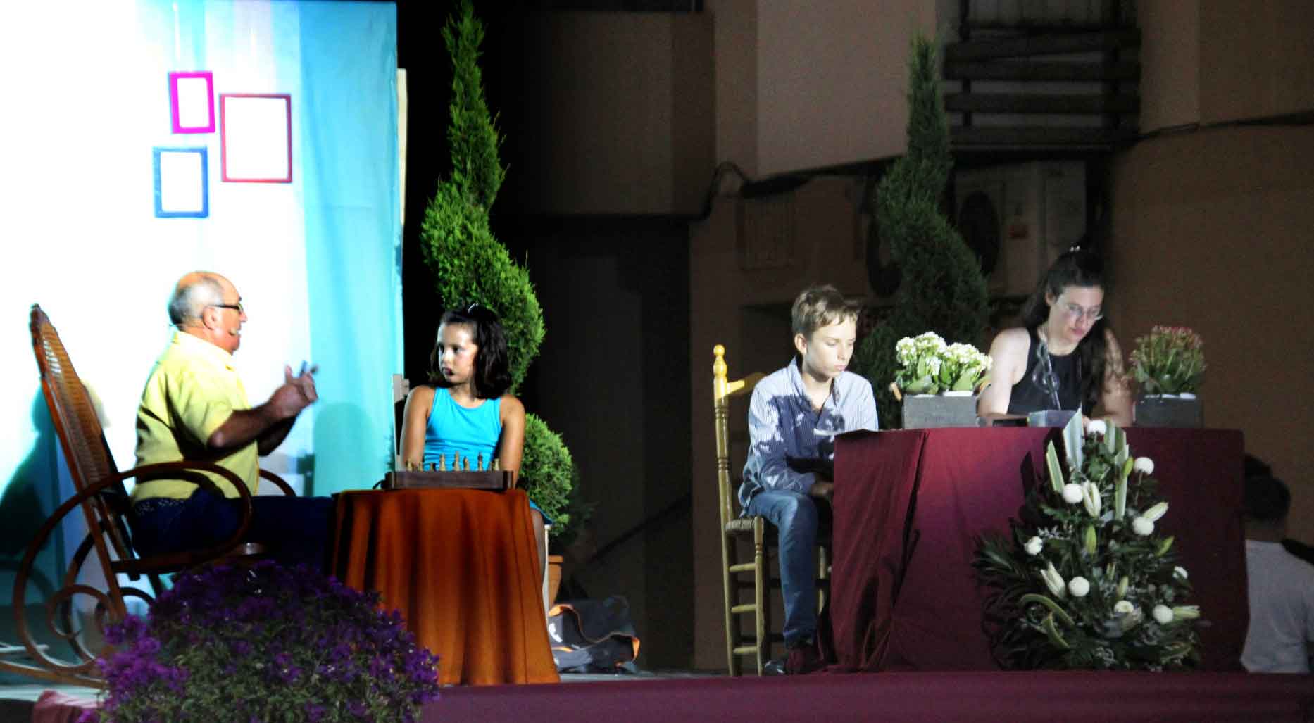 La función, que capturó al público desde el primer momento, resultó espectacular al aunar, en el peculiar escenario del tablero de ajedrez, que proporciona cuatro ángulos de visión al espectador, el teatro, la música sinfónica en directo, las canciones y la danza, y todo ello acompañado de una luminotecnia y efectos especiales que aportaron gran vistosidad a la obra. Hemos de subrayar que sorprendió comprobar cómo los pequeños actores y actrices habían memorizado sus diálogos a lo largo de las casi dos horas que duró la representación. A buen seguro que tenemos a más de una figura de la interpretación en ciernes. Y no debemos olvidar a los narradores, la encantadora niña Iris Cholbi Crisóstomo, que mostró unos innegables dotes de actriz pese a su corta edad, y al veterano Bartolomé Bas, Aspirina, que nos obsequiaron con unos momentos inolvidables al bordar sus magníficos diálogos. En realidad, más que narradores fueron auténticos actores integrados con los que actuaron sobre el escenario.